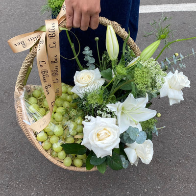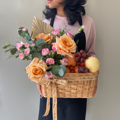 Kotak buah anyaman rotan dengan hiasan bunga segar dari Le Bliss Bouquet, pilihan hadiah elegan dan sehat untuk berbagai acara. Parcel Buah Jakarta - Fruit Hamper Bintaro dan Jakarta | Toko Parcel Buah Mewah by Le Bliss Box