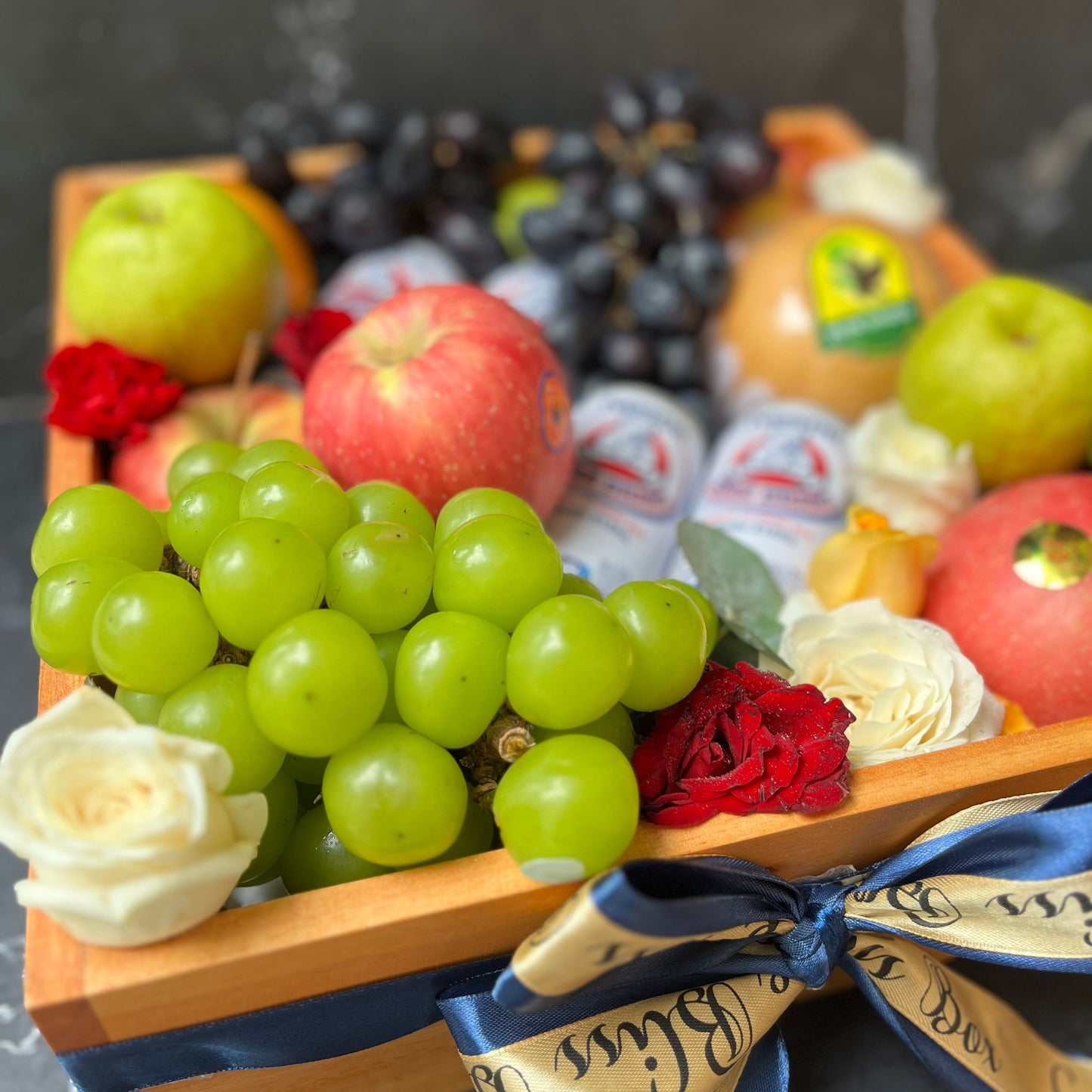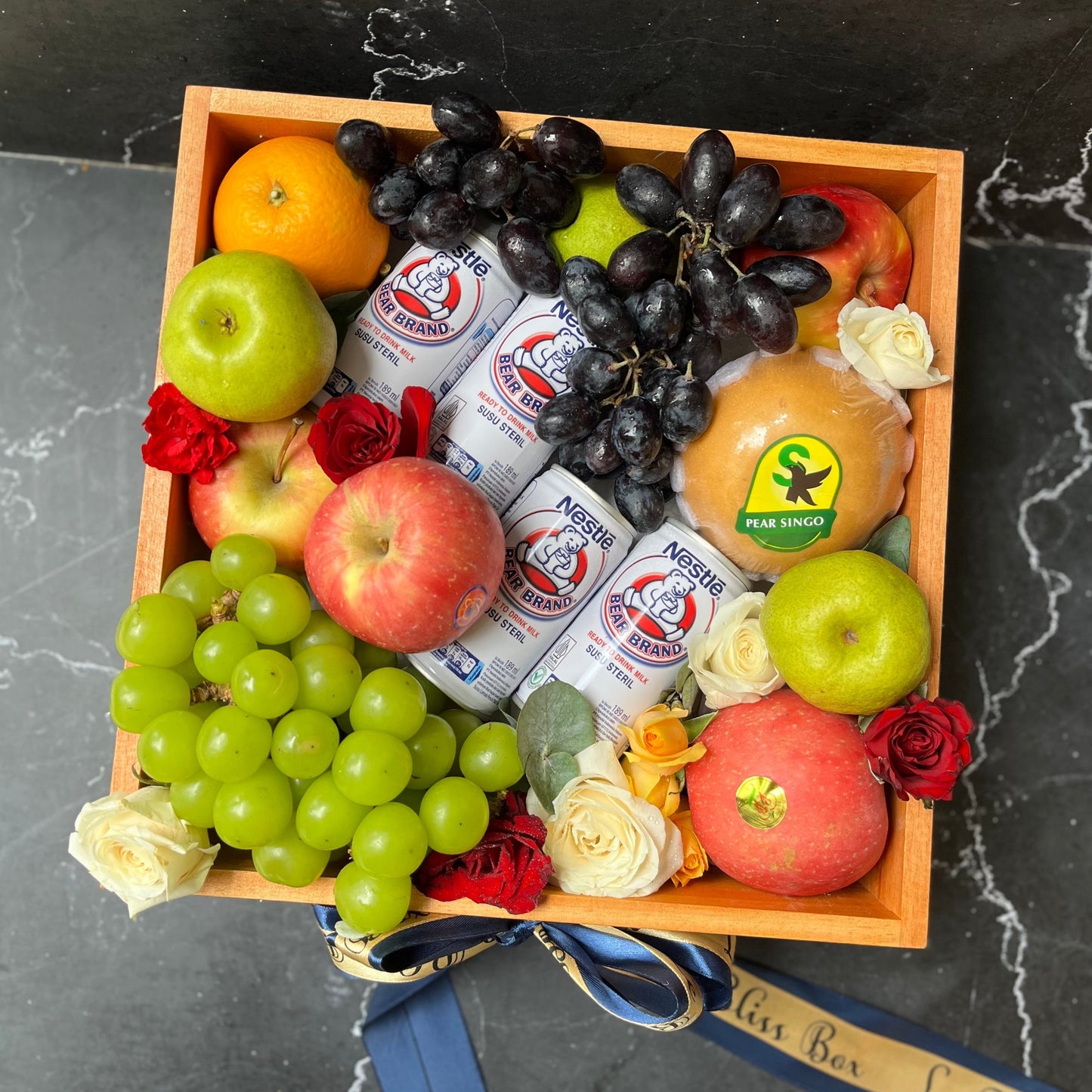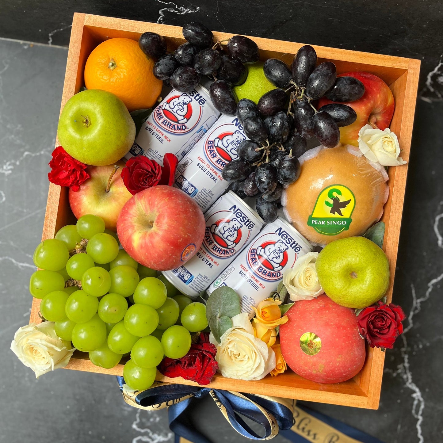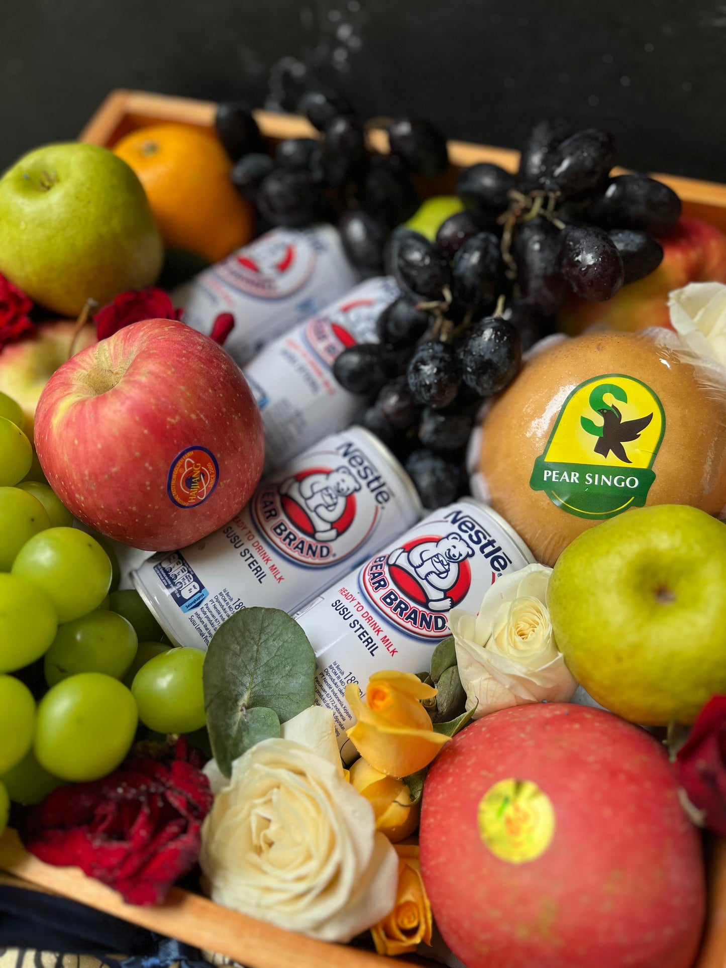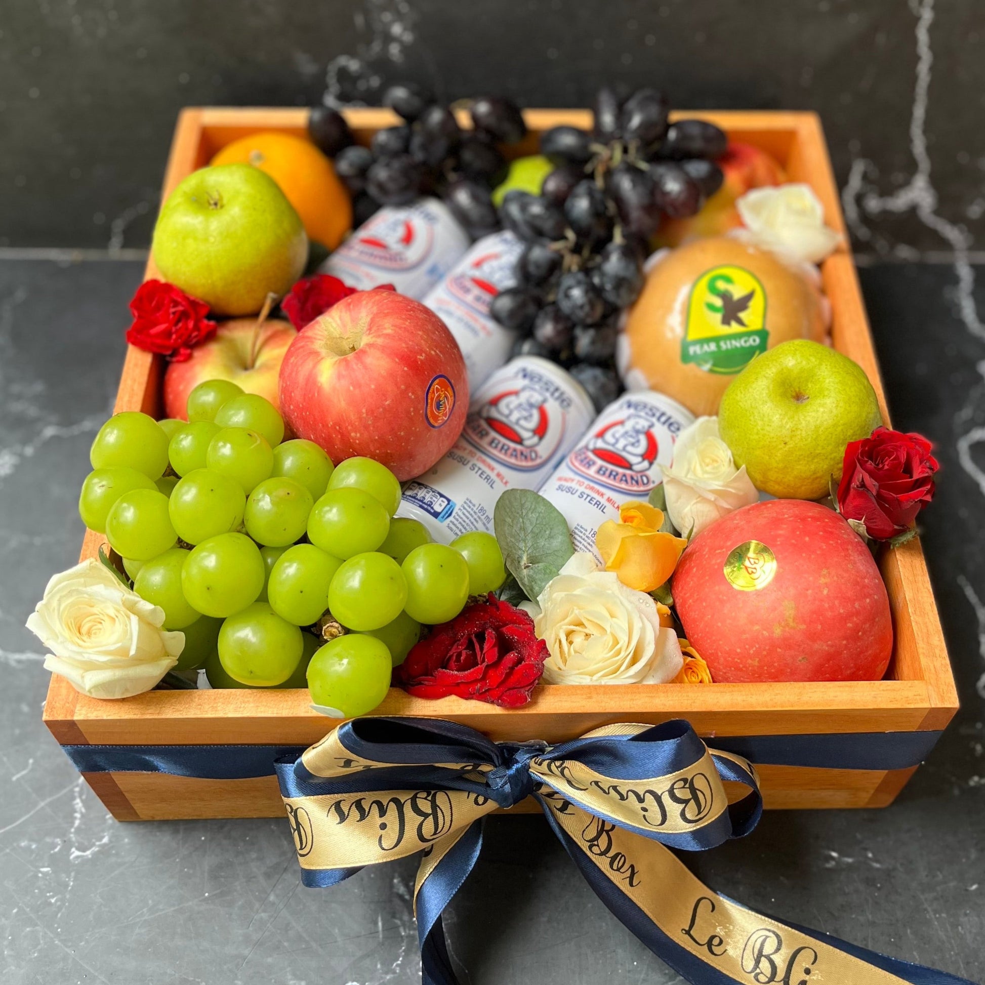 Bear Brand Wooden Fruit Box adalah parcel eksklusif dengan isi 10 buah segar, 4 susu Bear Brand, 1kg anggur premium, dan topping bunga mawar serta anyelir segar. Dikemas dalam box kayu ukuran 32cmx32cmx10cm, cocok untuk hadiah spesial. Parcel ini tidak hanya memberikan tampilan yang cantik, tetapi juga kaya manfaat kesehatan.