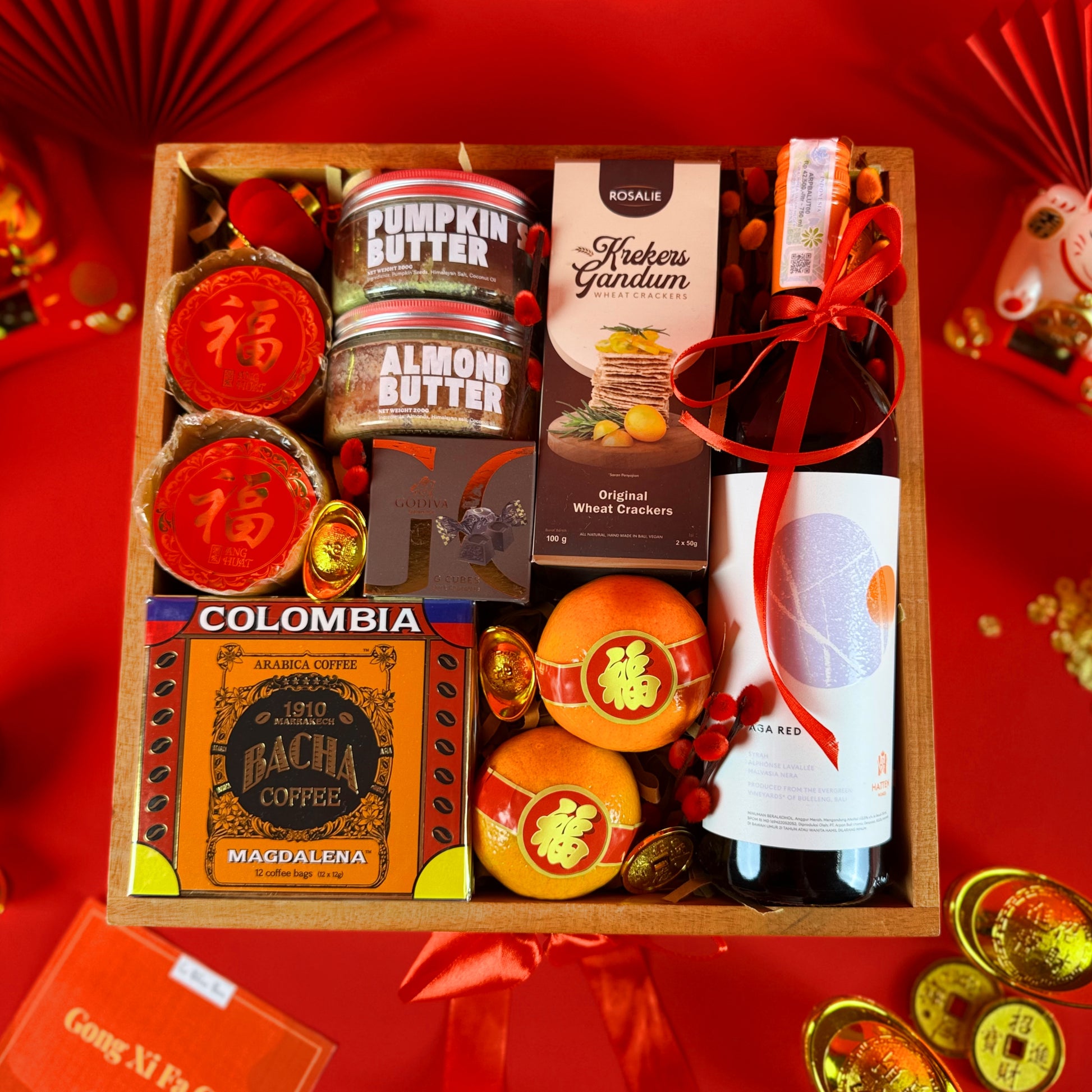 - 1 Aga Red Bali Red Wine, 1 Pumpkin Seed Butter, 1 Almond Butter, 1 Roasted Cashew, 2 kue keranjang/ Nian Gao, 1 Bacha Coffee, 2 Mandarin Oranges, 1 Godiva G Cubes, 1 Artisan Wheat Crackers