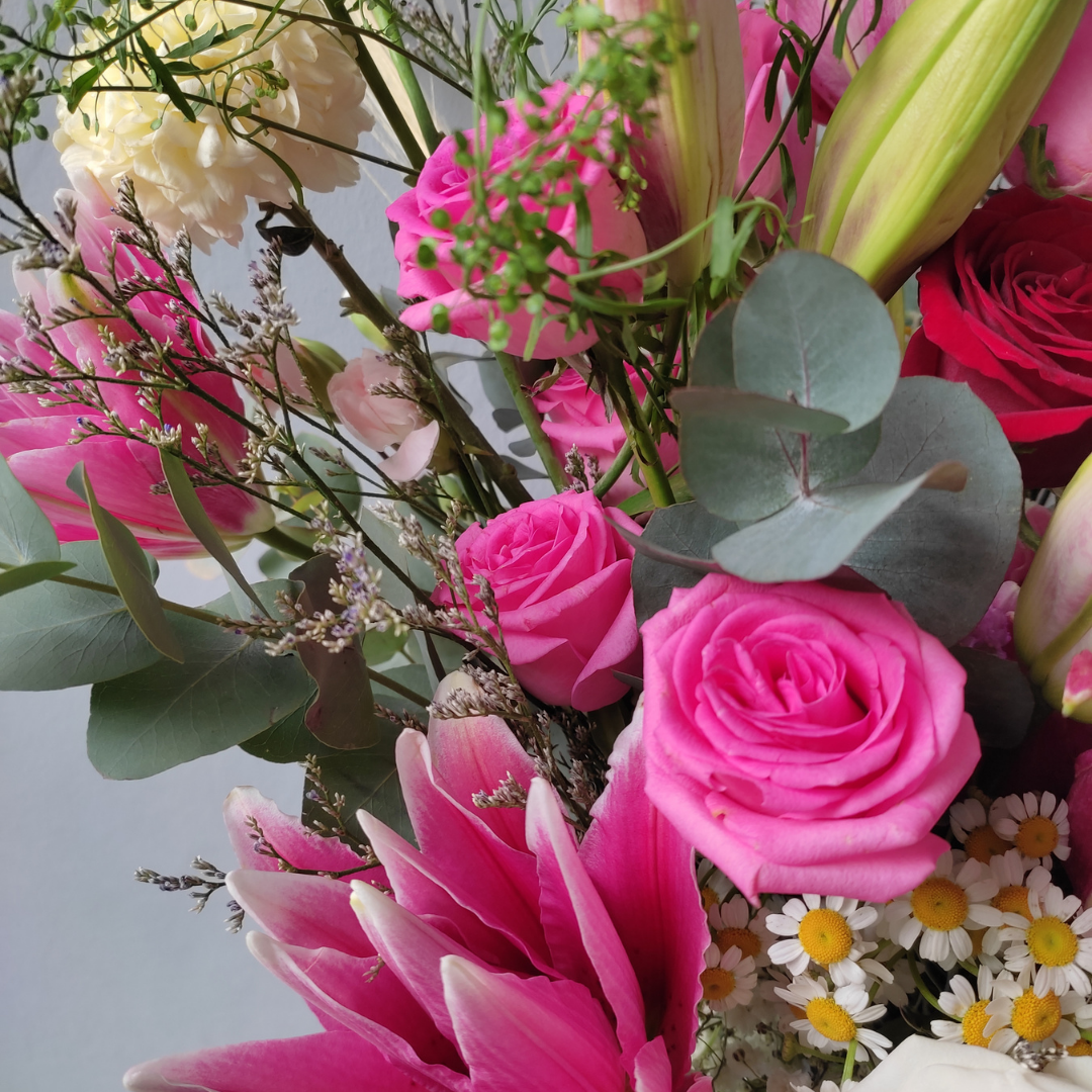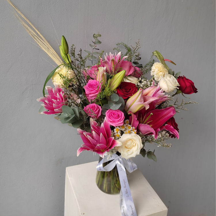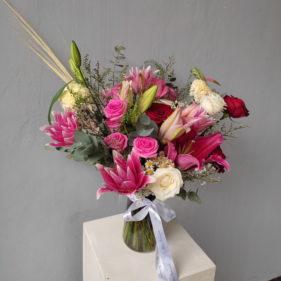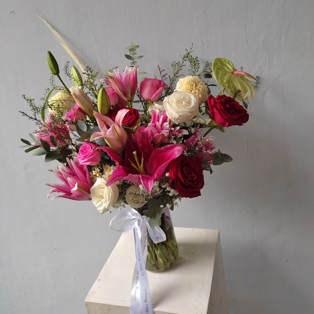 Shop Le Bliss Bouquet presents the enchanting "Blissful Pink Fanta Lily Red Vase," a mesmerizing floral arrangement featuring the finest blooms. This exquisite vase showcases a delightful combination of Roselily Pink Fanta, Lily Casablanca Pink Fanta, Pink Revival Rose, Red Rose, and Anthurium, creating a harmonious blend of colors and textures to elevate any space.