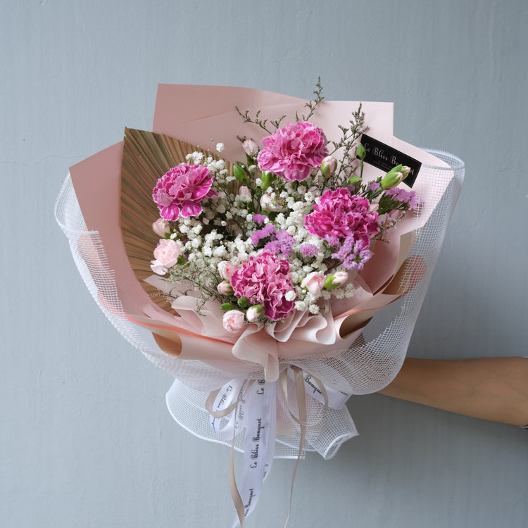 Discover Elegance: Cherry Carnation Bouquet by Le Bliss Bouquet. Crafted with care, this delightful arrangement features Carnation Nobbio Cherry from Holland, complemented by Ecuadorian baby's-breath and charming small flowers, elegantly wrapped in pink packaging. Perfect for any occasion, enjoy nationwide shipping and a complimentary greeting card with every purchase. Approximate dimensions: Height 35cm x Length 25cm x Thickness 37cm. Shop now at Le Bliss Bouquet.