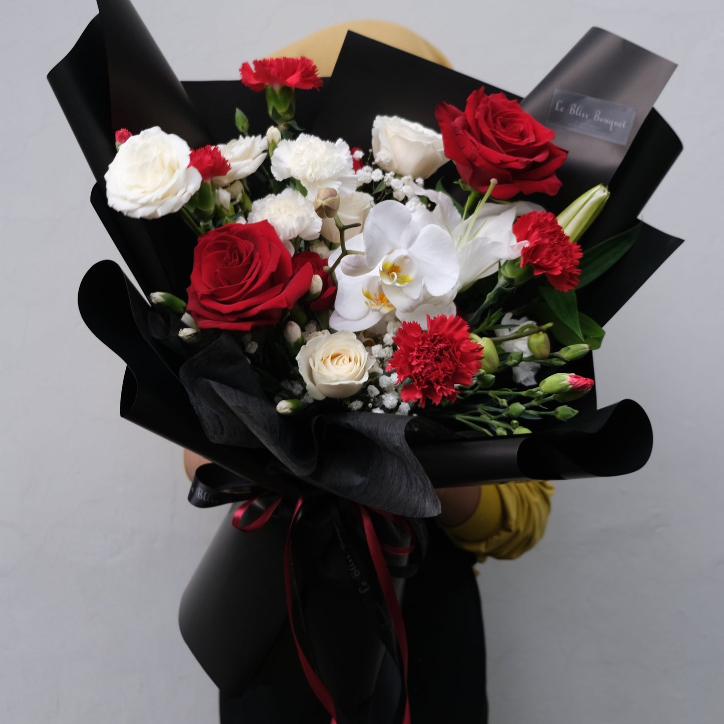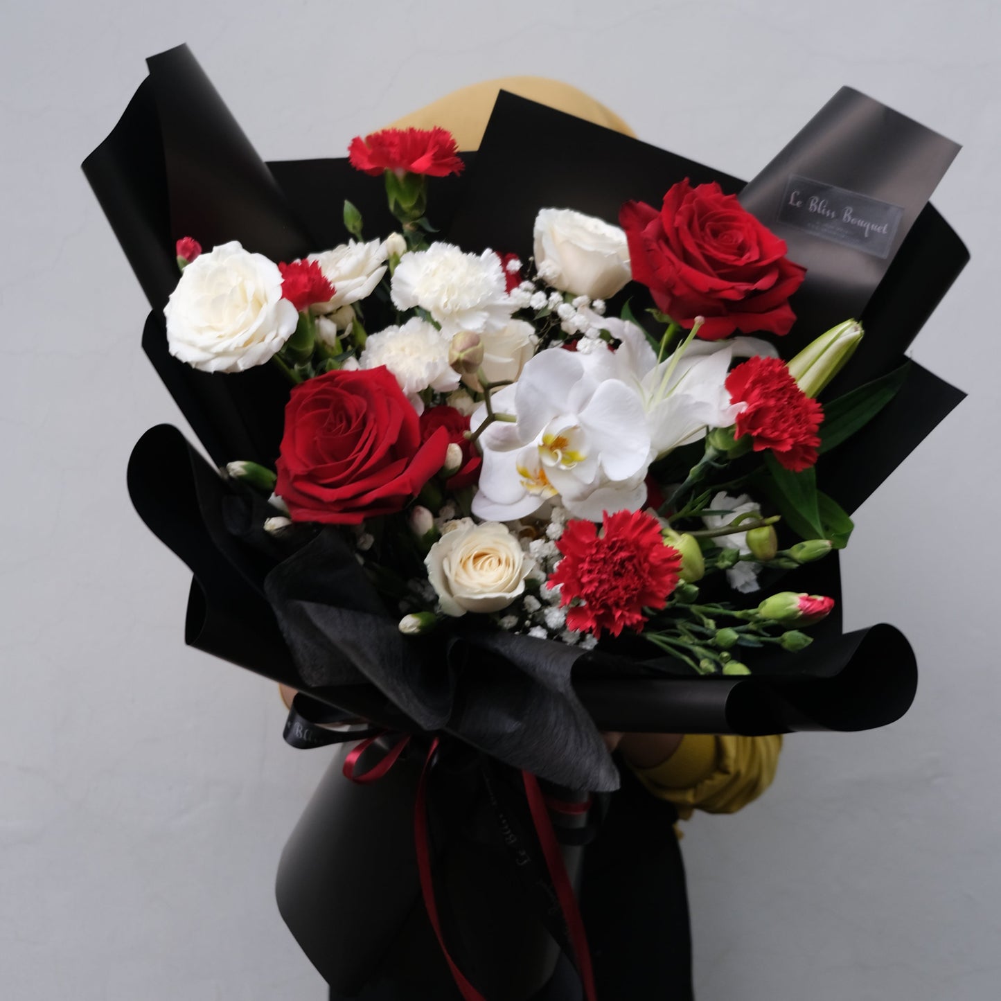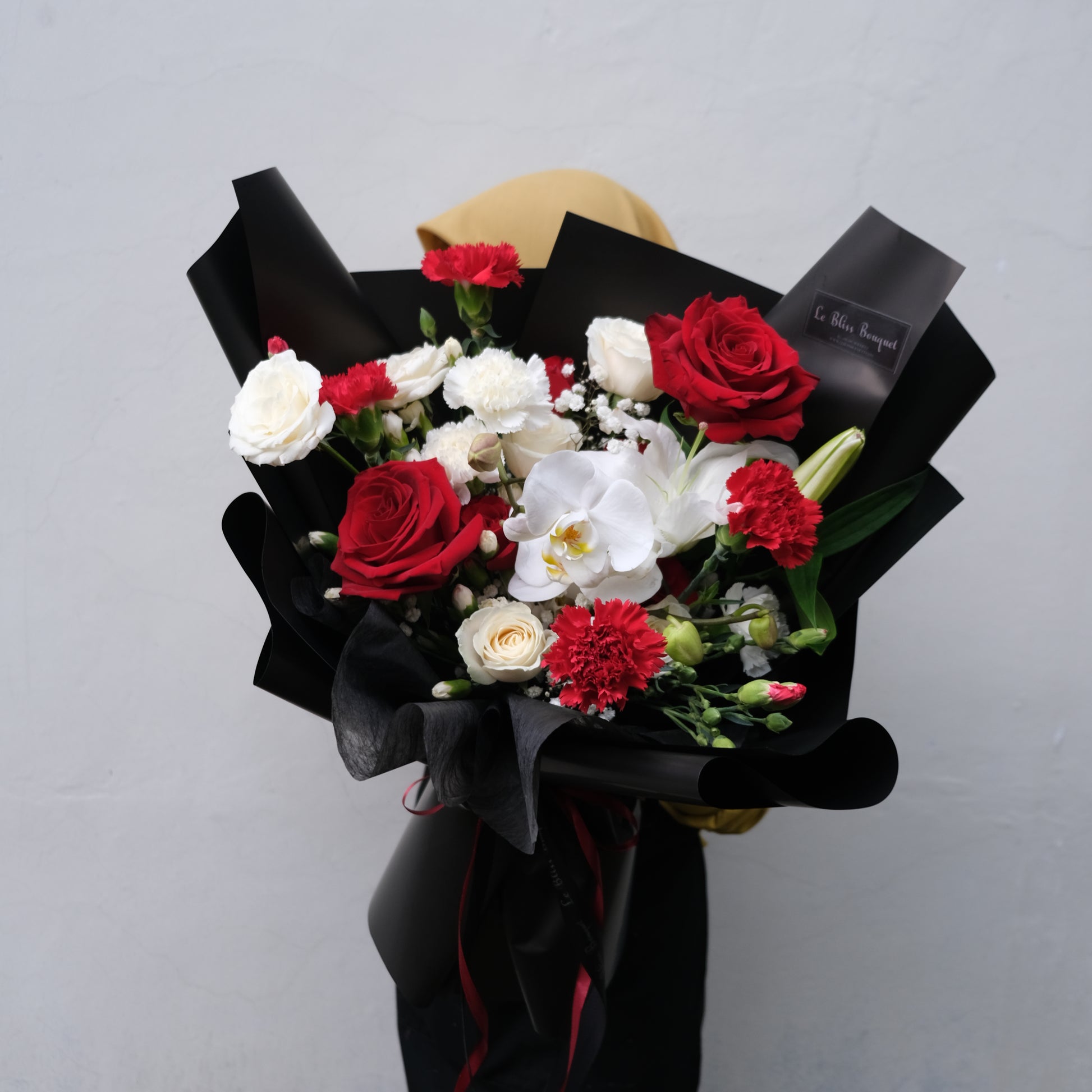 The Classic Red and White Rose Orchid Bouquet from Le Bliss Bouquet is a timeless and elegant floral arrangement featuring vibrant red and white roses paired with delicate white orchids. This luxurious bouquet, wrapped in sophisticated black, creates a striking display, perfect for celebrating special moments such as anniversaries, birthdays, or simply to express love and appreciation. Handcrafted by our expert florists, each bloom is carefully selected for its freshness and beauty. Available for delivery to Jakarta, Bintaro, Cirebon and Tangerang, this bouquet will leave a lasting impression on anyone who receives it. Order now for a memorable floral gift!