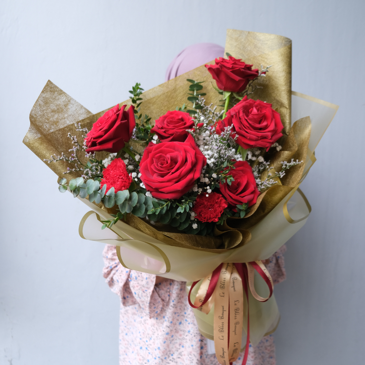 - Fresh flowers arrangement: Explorer Ecuador Rose, Carnation Red, Caspea, Babysbreath, Eucalyptus