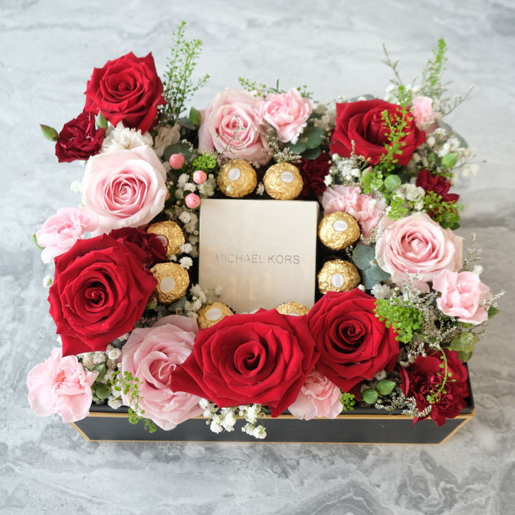 Presenting our Ferrero Flat Gift in a Gift Box – a unique way to enhance your gift-giving experience! Ditch the regular gift wrap and opt for an extra touch of floral magic. Simply send your special present to us, and we'll expertly arrange it with beautiful flowers in a stylish P30 x L26 x T12 box. Price may vary based on the size of your gift. Inclusion: Fresh Flowers, Black Box, 6 Ferrero.
