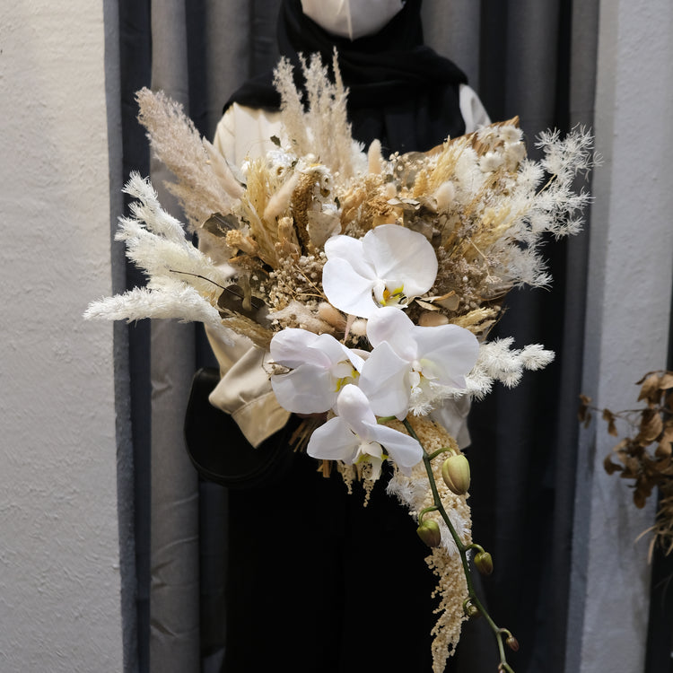 Shop Le Bliss Bouquet presents the epitome of bridal elegance with our Fresh Orchid & Everlasting Cascade Bridal Bouquet. This exquisite bouquet is meticulously crafted in a cascade style, perfect for weddings. Featuring fresh orchids combined with everlasting real flowers, it embodies everlasting beauty for your special day.