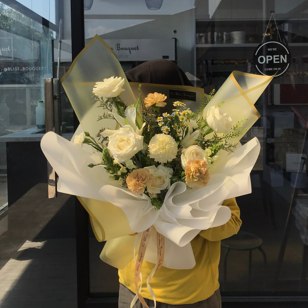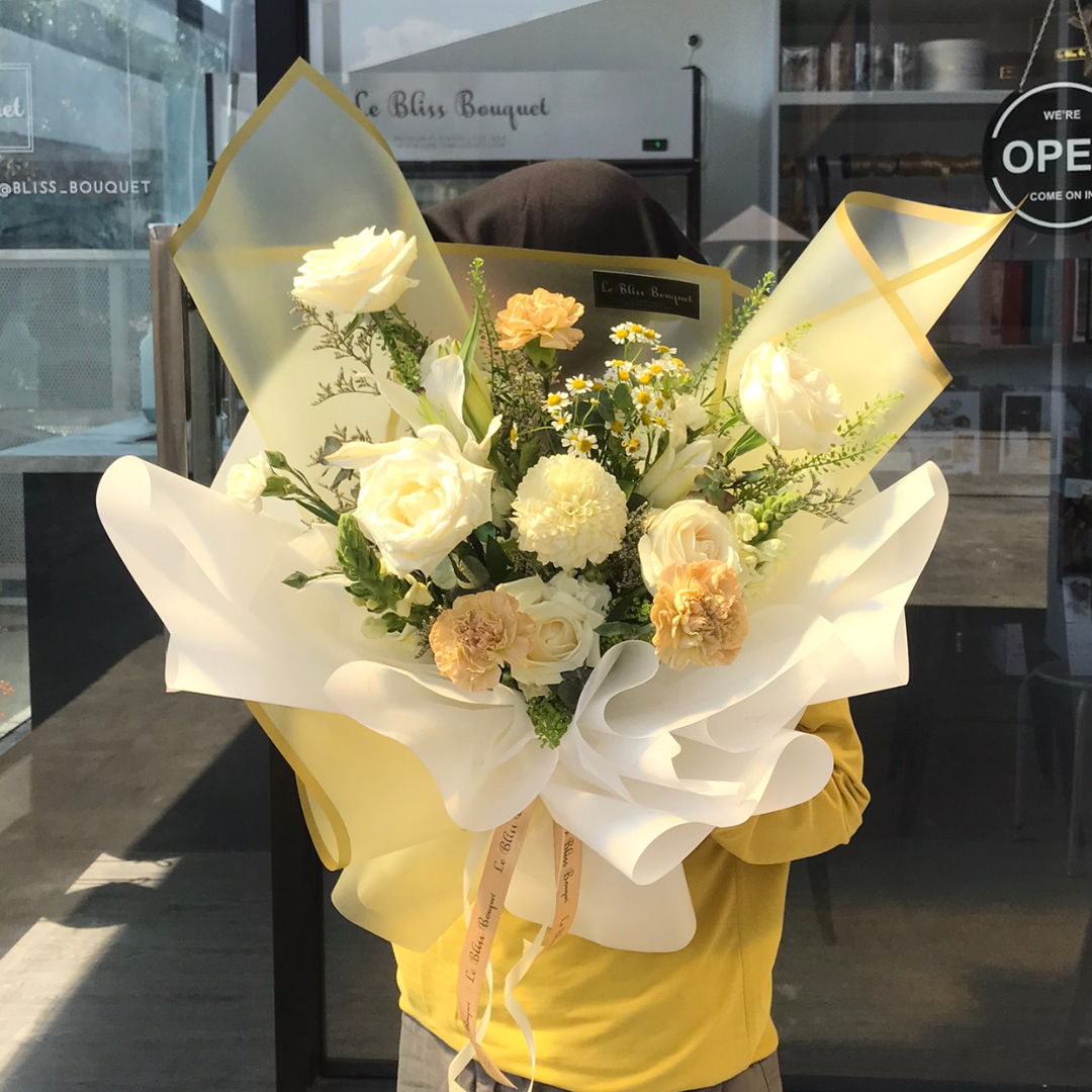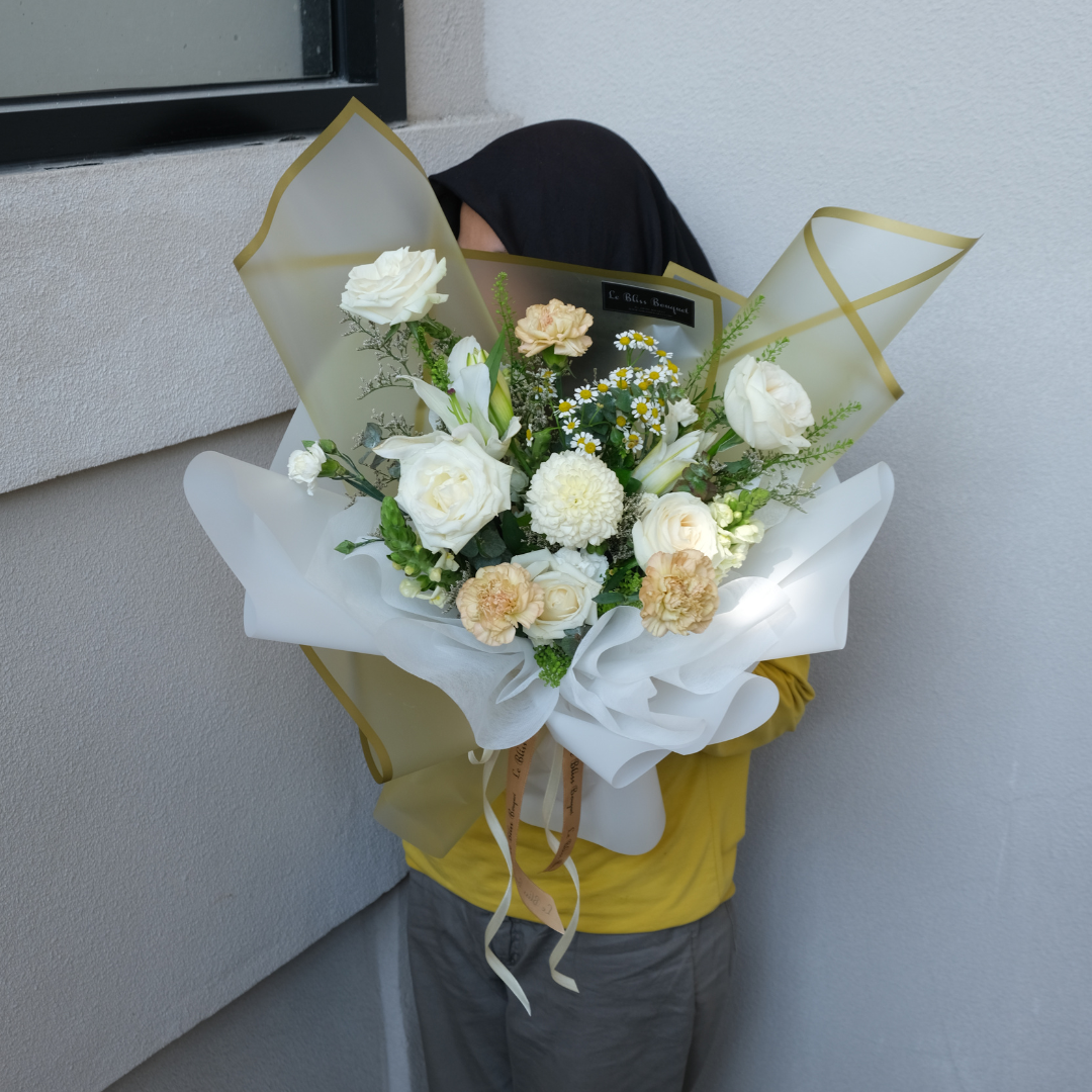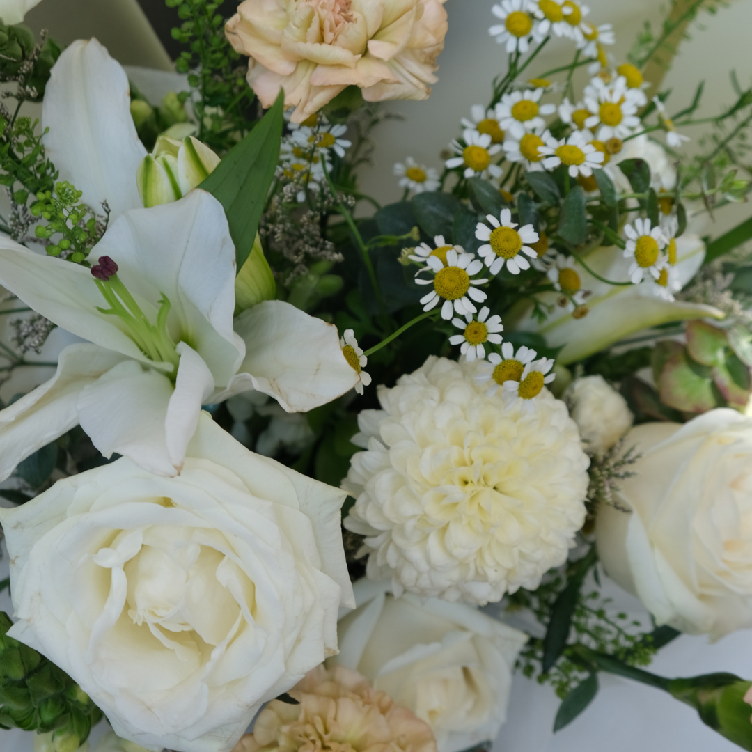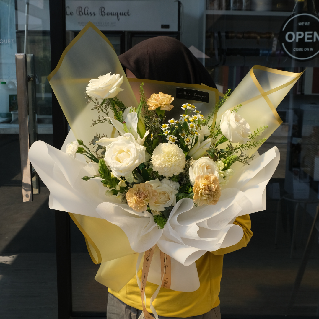 Shop Le Bliss Bouquet presents a Garden White Yellow Bouquet, a delightful blend of White Rose, Chamomile, Carnation, and Lily. Perfect for any occasion, this bouquet emanates elegance and charm, making it an ideal choice to brighten someone's day.
