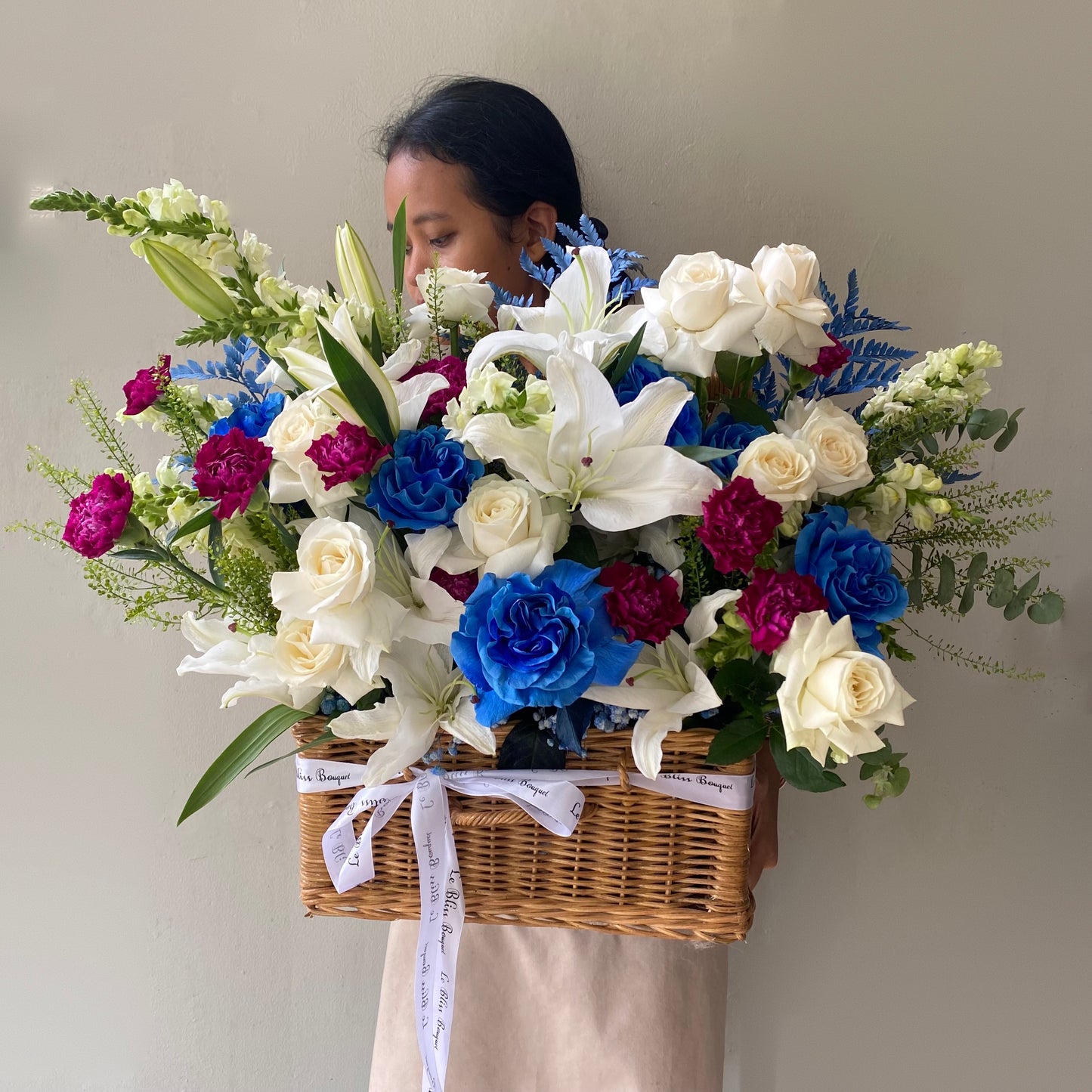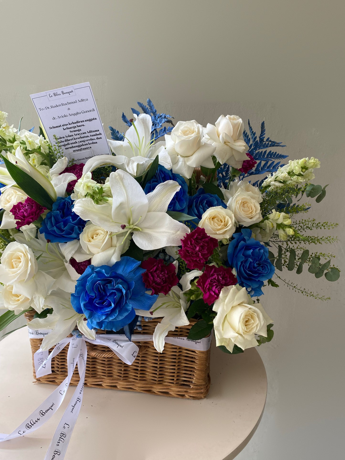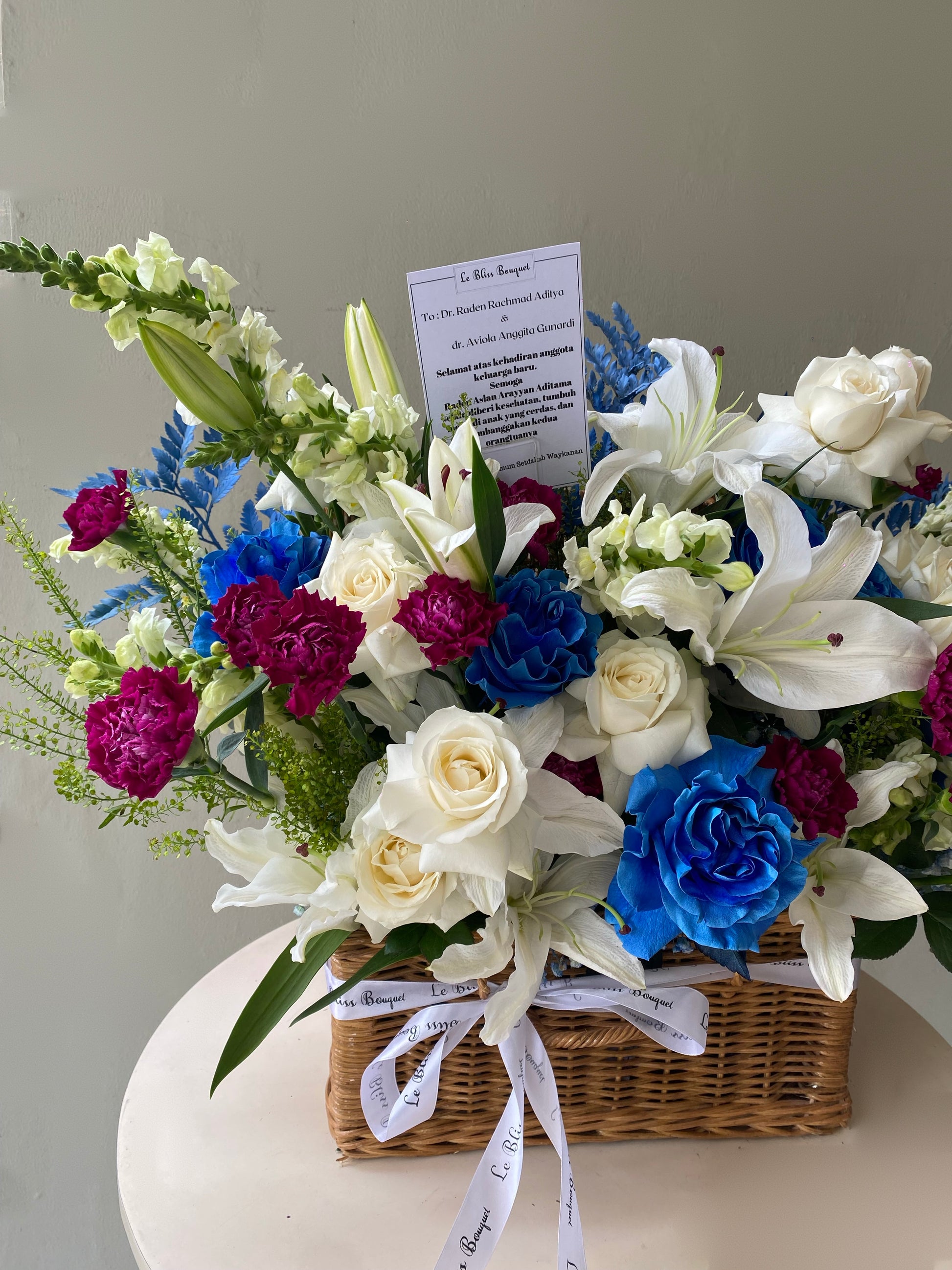 Made from Ecuador-dyed blue roses, purple carnations, Casablanca white lilies, and white roses, all arranged in a grand rattan basket. Perfect for a baby boy, as a gift for him, or for any occasion.