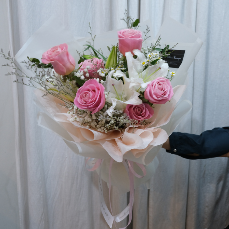 - Fresh flowers arrangement: Hermosa rose from ecuador, white lily casablanca, carnation, statice, caspea, and other fillers