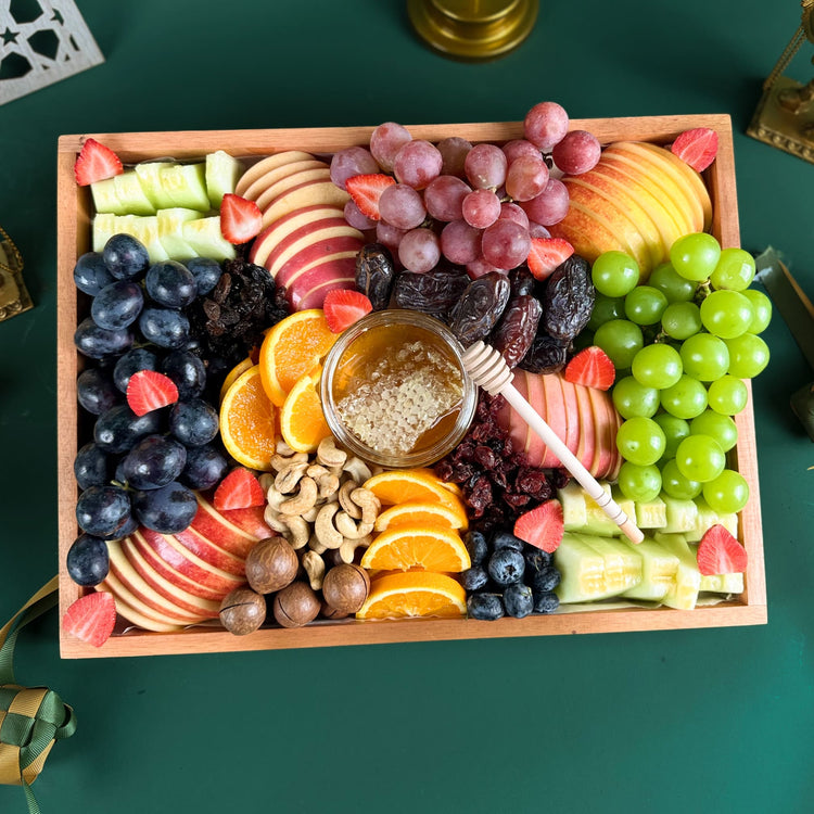 - Fresh fruits: apple slices, orange slices, green grape, black grapes, red grapes, strawberry, blueberries