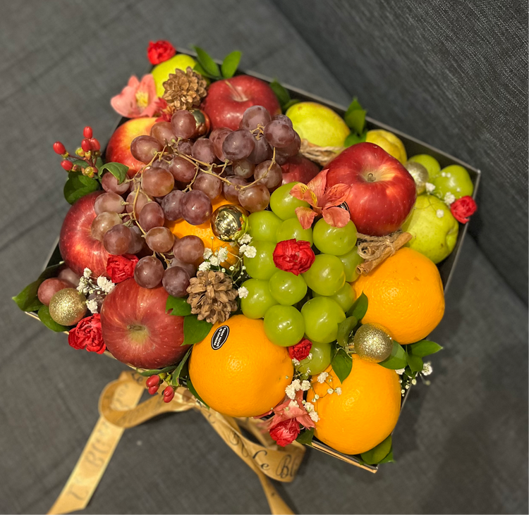 Celebrate the warmth of the holidays with our Christmas Cheer Fruit Box. This festive arrangement includes an assortment of premium fruits topped with vibrant seasonal flowers, pinecones, and decorative ornaments, adding a touch of holiday magic. Ideal for gifting during Christmas gatherings, sending festive well-wishes, or bringing joy to someone special.