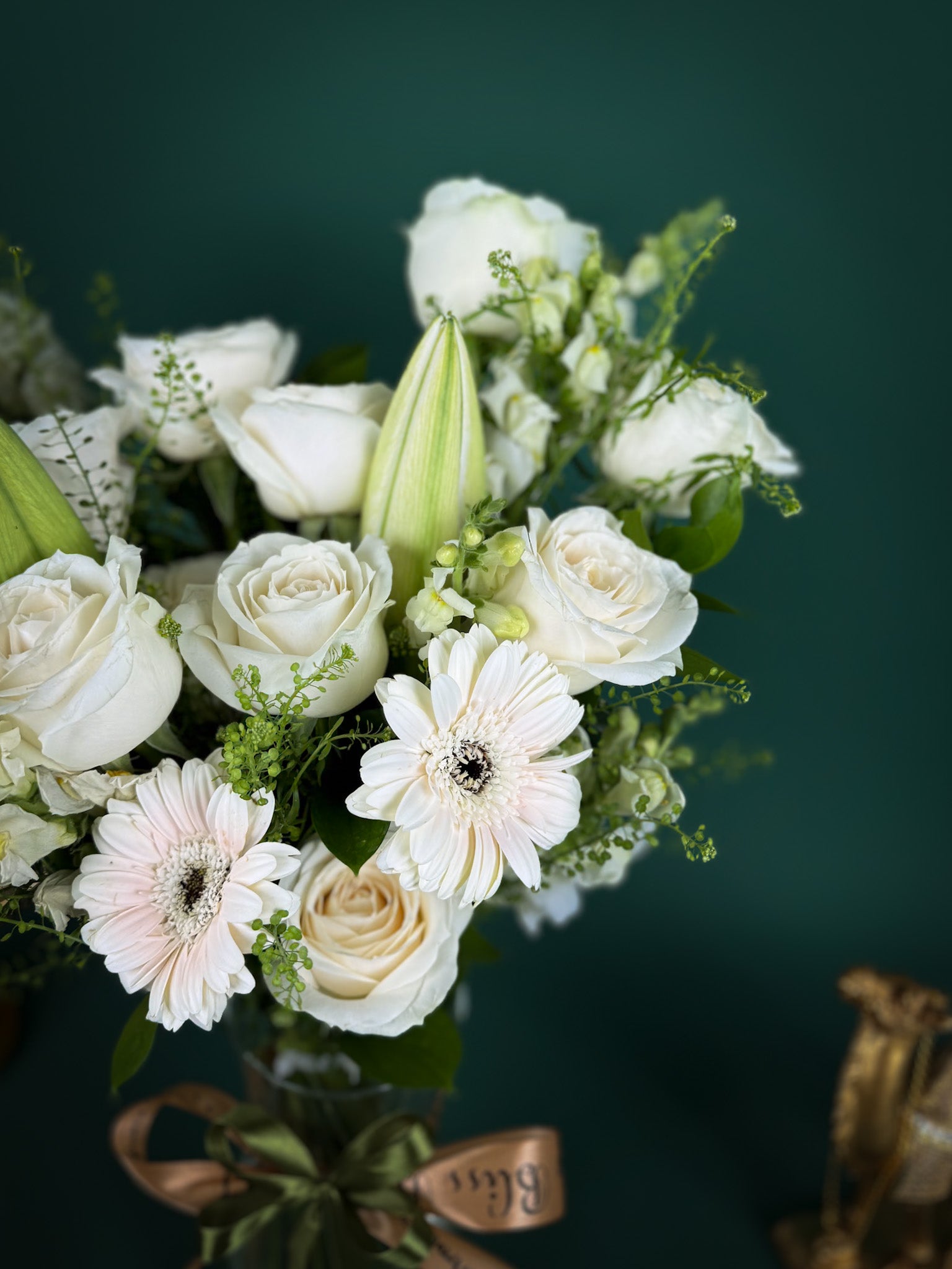 - Fresh flowers arrangement: lily, white rose, gerbera daisy, snapdragon, and fillers