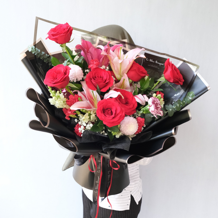 Introducing the Lily Marlon Red Rose Bouquet by Le Bliss Bouquet—a masterpiece of premium fresh flowers. This stunning arrangement features the captivating Lily Marlon, complemented by the allure of sexy red roses and the beauty of carnation Damascus. Each bloom is thoughtfully curated to create a bouquet that is not only visually enchanting but also destined to deepen the bonds of love. Perfect for anniversaries and birthdays, let this bouquet be the embodiment of your affection. Elevate your gifting experience with Le Bliss Bouquet's signature blend of elegance and romance.