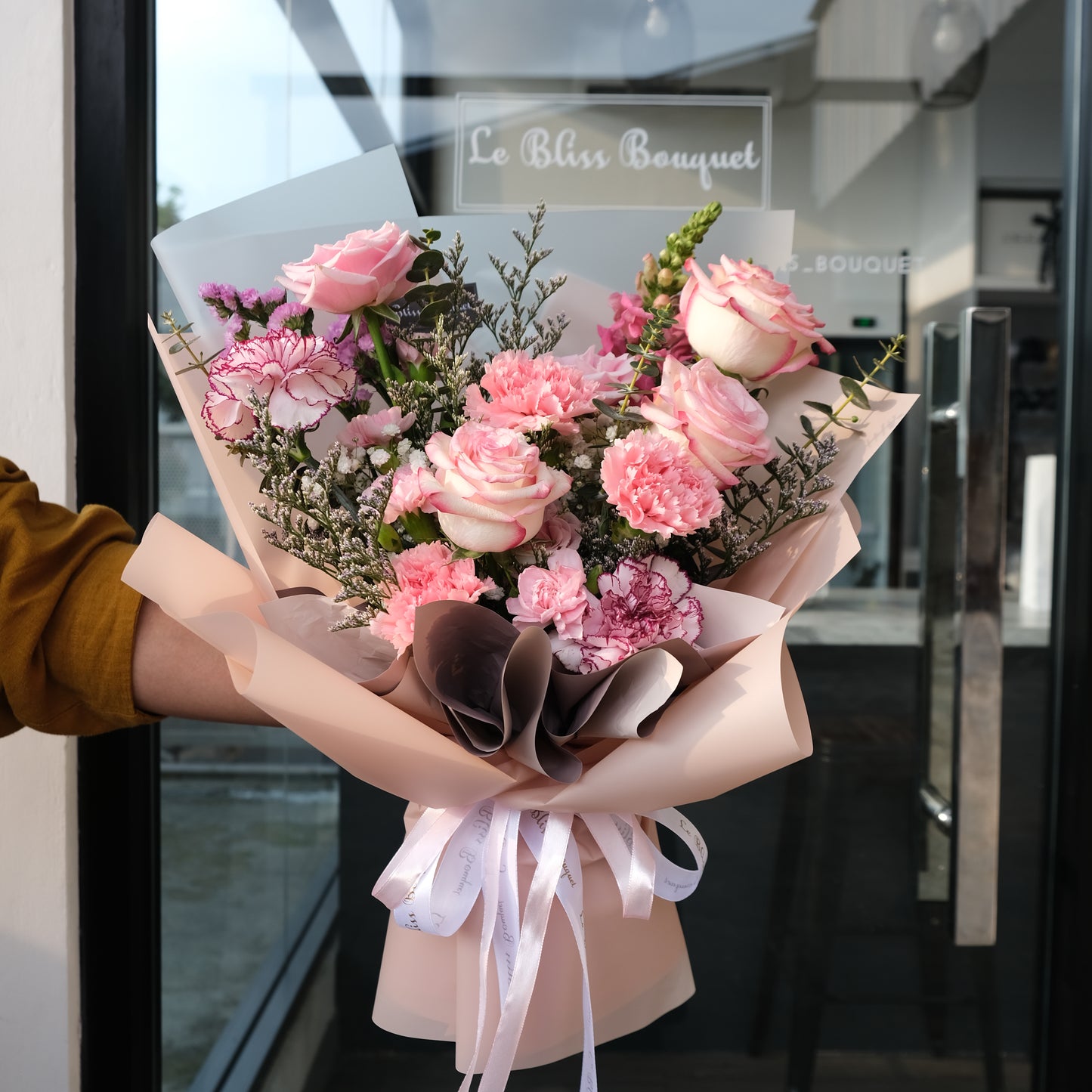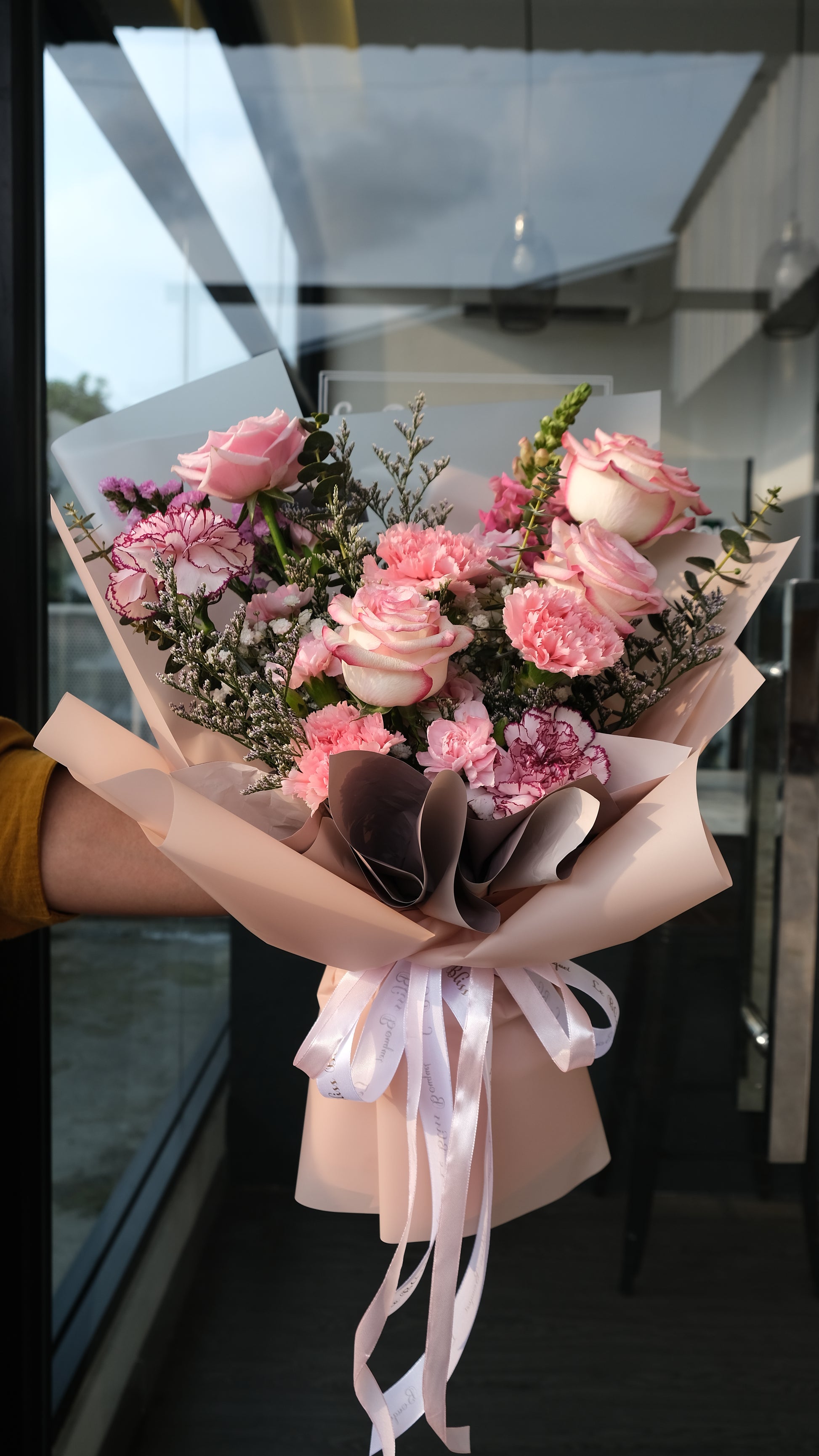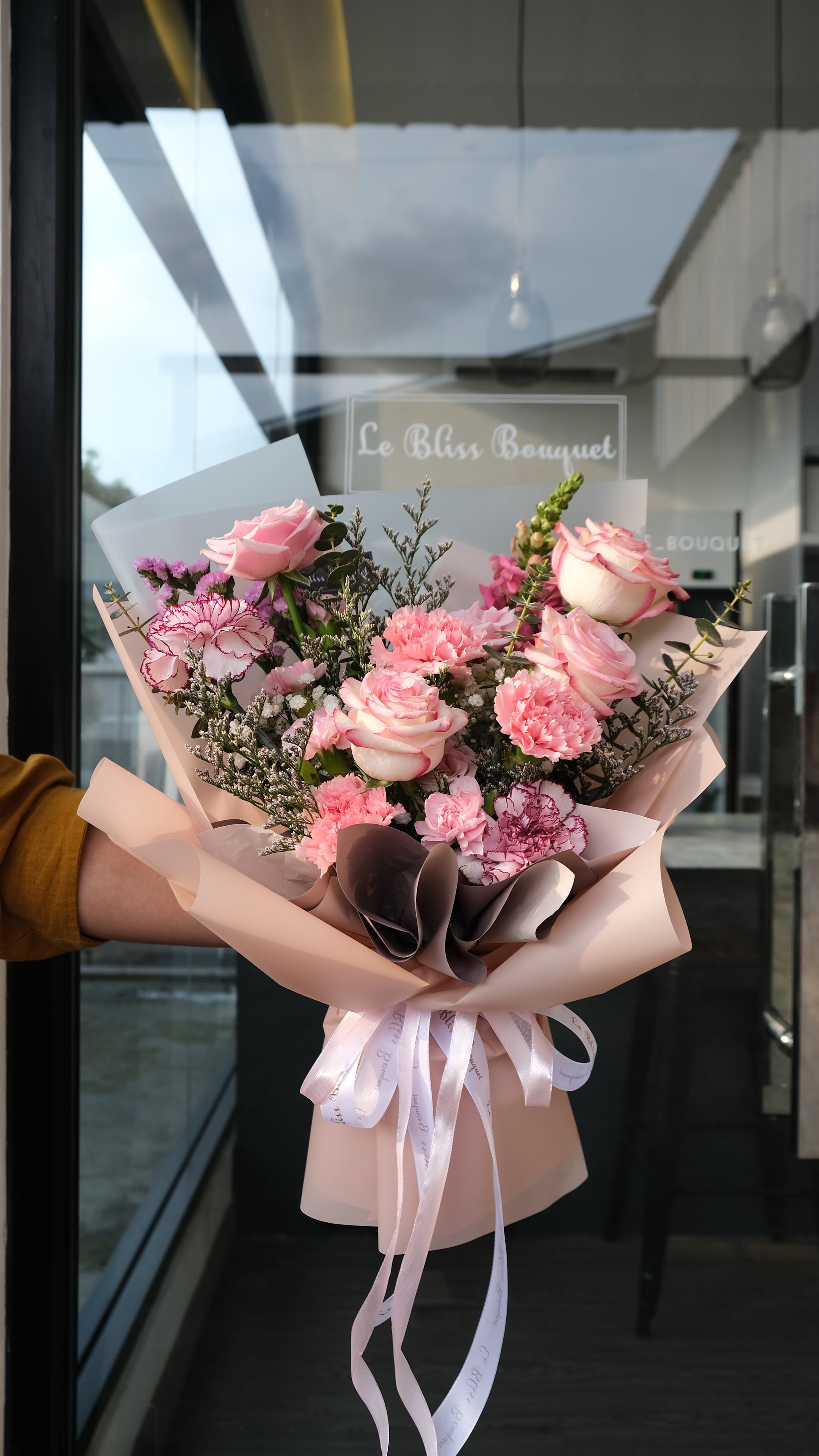 main flowers: Paloma Rose from Ecuador, Carnation Damascus and soft pink, Snapdragon, Caspea, Eucaluptus. Perfect for any ocassion, to those who loves pink!