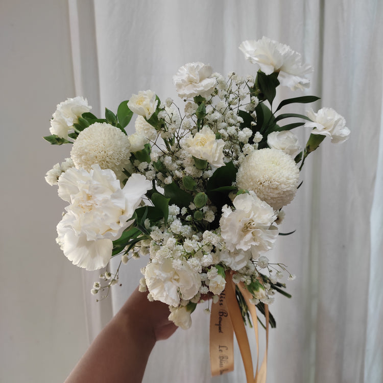Shop Le Bliss Bouquet presents the Petite White Prewed Bouquet, an exquisite choice tailored for prewed photoshoots. This dainty arrangement features a delightful ensemble of chrysanthemums, carnations, baby's breath, exuding elegance and charm. Perfect for capturing timeless moments, this bouquet adds a touch of romance to any prewedding occasion.