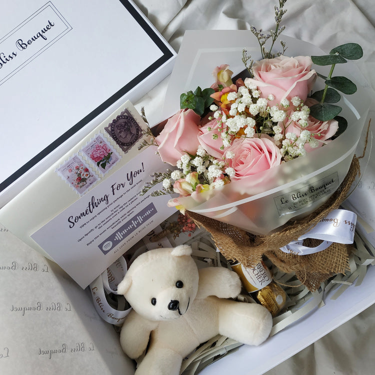 π· Imported Fresh Flower Bouquet (Semi Holland Roses + Ecuadorian Baby's Breath) with customizable wrapping. πΈ Polaroid Flower String with 6 cherished photos. π Customizable Letter for that personal touch. πΆ Spotify Playlist Barcode Card to set the mood. π§Έ Teddy Bear for a cuddly companion. π« Ferrero Rocher for a sweet treat.