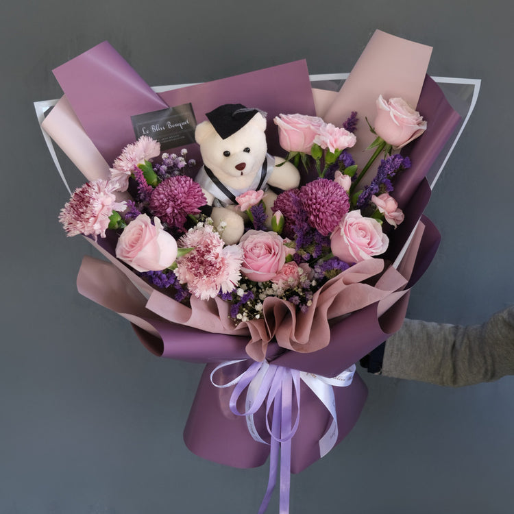 Celebrate your graduate's success with our Purple Fresh Graduation Bouquet from Le Bliss Bouquet! This vibrant arrangement is a thoughtful way to show your congratulations. Purchase now and receive a free greeting card to add a personal touch. Size: P40 x L40 x T50. Shop at Le Bliss Bouquet for an elegant and meaningful graduation gift!