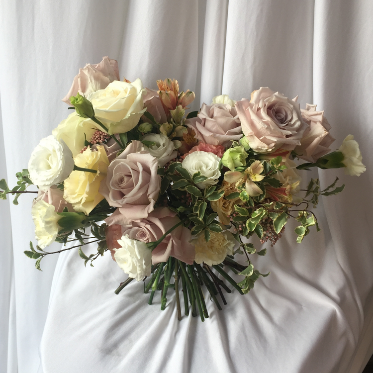 Shop Le Bliss Bouquet presents the exquisite Quicksand Rose Bridal Bouquet. Crafted with premium blooms sourced from Ecuador, this signature piece boasts a 360-degree style, ensuring elegance from every angle. With meticulously arranged Quicksand roses adorning the front, back, and sides, this bouquet promises timeless beauty for your special day.