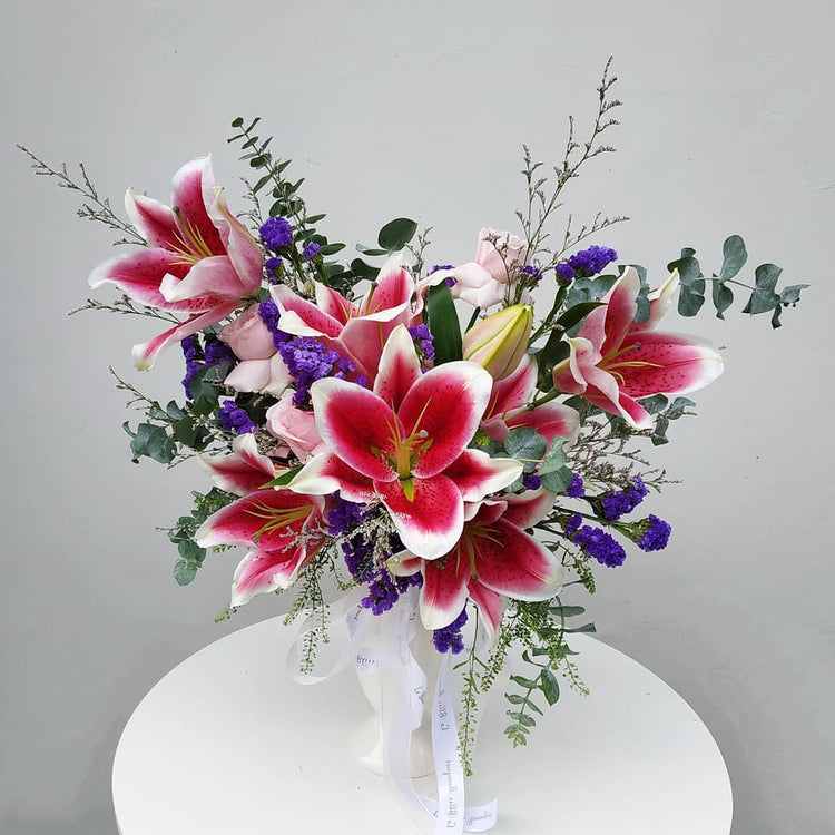 Fresh flowers arrangement: Red lily casablanca, statice, pink roses, caspea, foliage