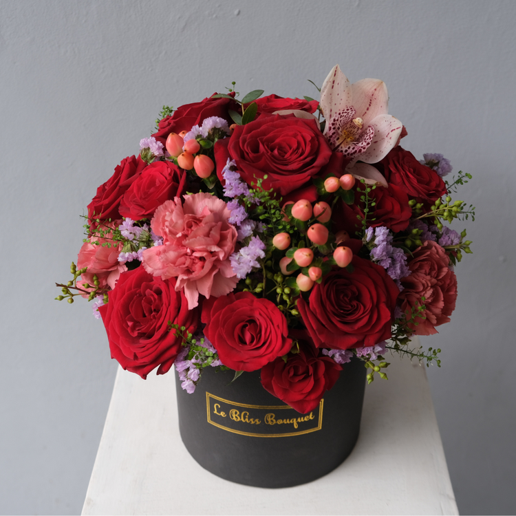 Celebrate classic anniversaries with our Red Naomi Elegant Fresh Petite Bloombox, featuring the timeless Naomi Rose.