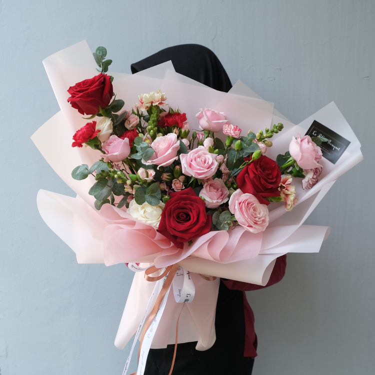 - fresh flowers arrangement: red explorer rose, pink rose, carnation spray, snapdragon, carnation standard and other flowers