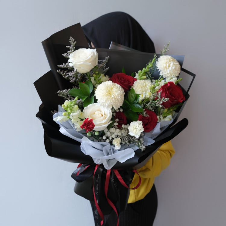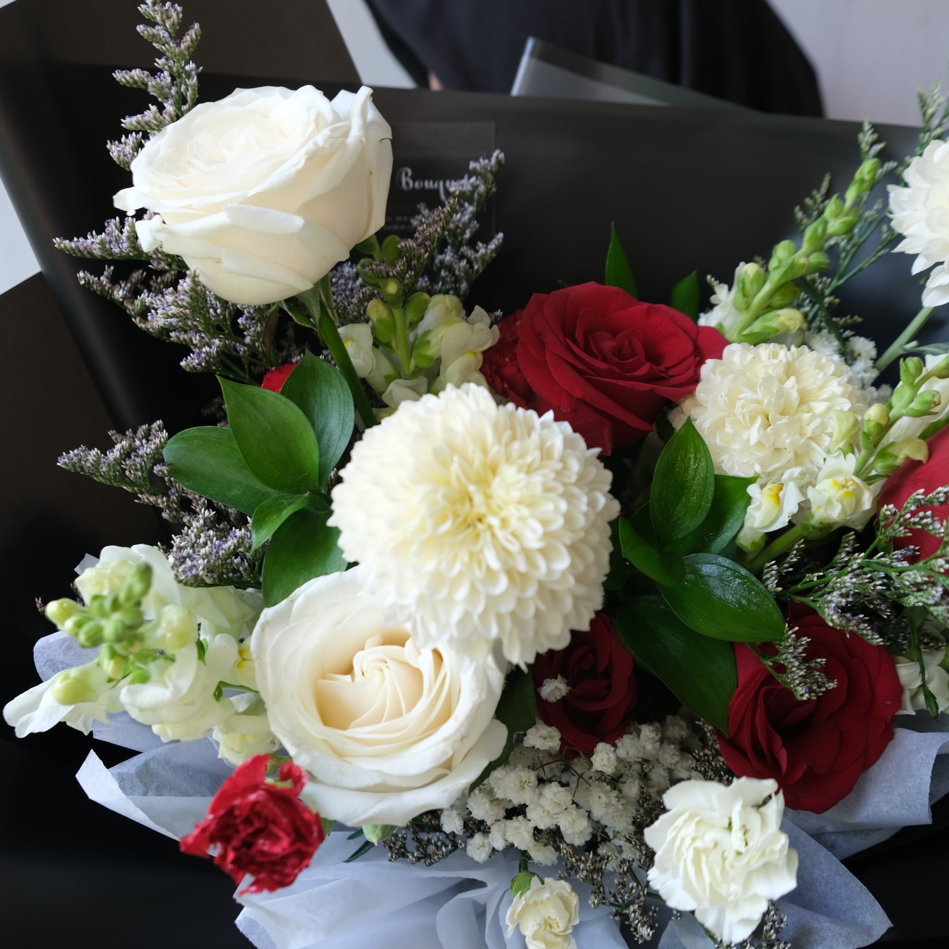 - Fresh Flowers arrangement: white rose, red rose, gompie (seasonal), snapdragon, white & red carnation, babysbreath, other fillers