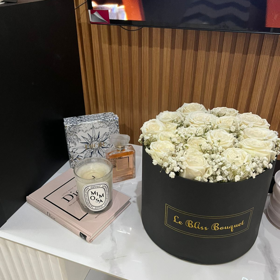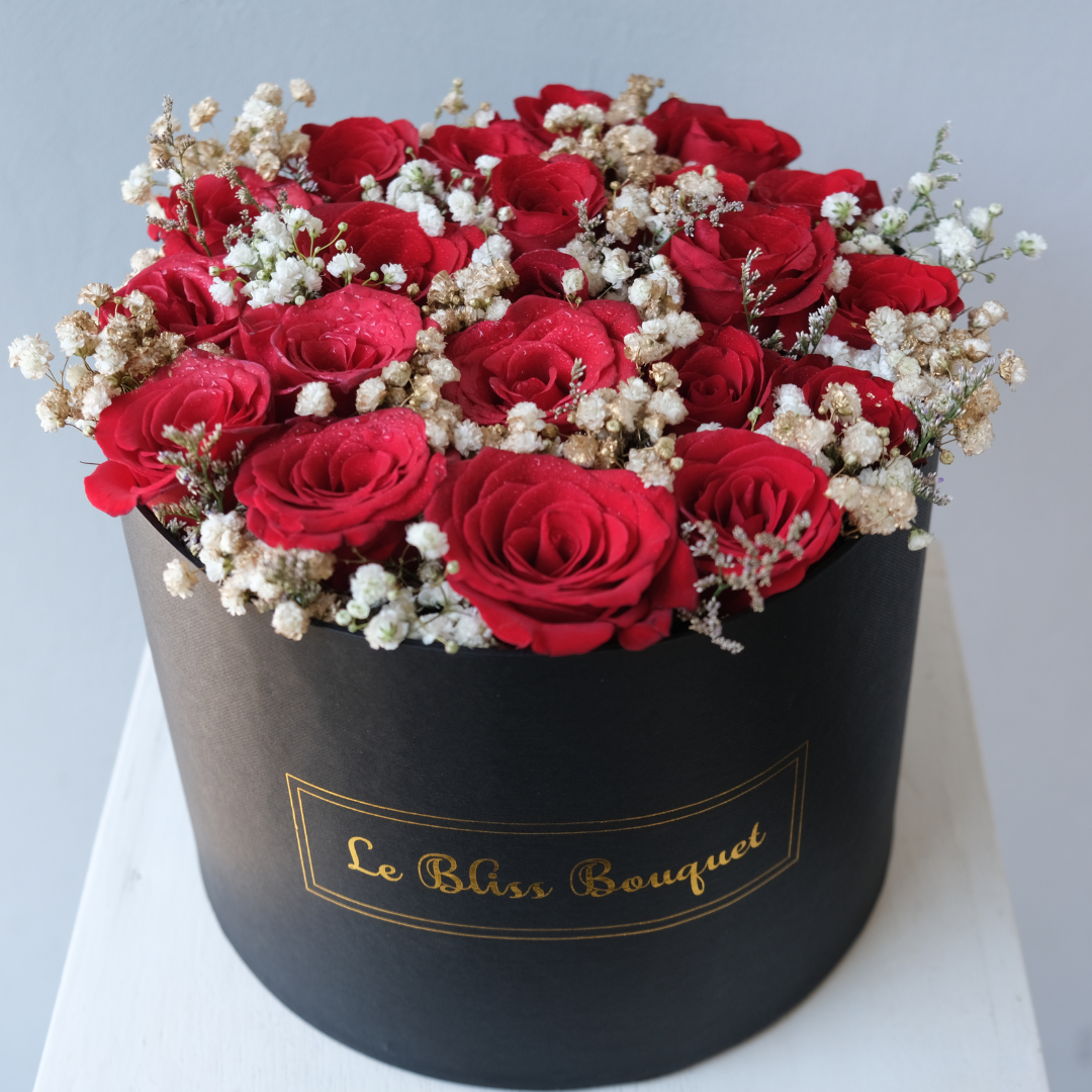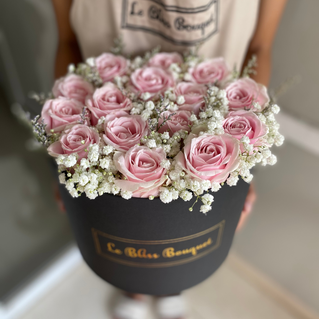 This exquisite arrangement features 20 fresh premium roses & imported babysbreath from Ecuador elegantly presented in a 23cm box, showcasing the epitome of classic and romantic charm.