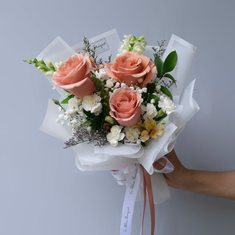 - Fresh flowers arrangement: 3 RP Moab Rose from Ecuador, Babysbreath, Carnation White, Snapdragon, Alstromeria, caspea, foliage