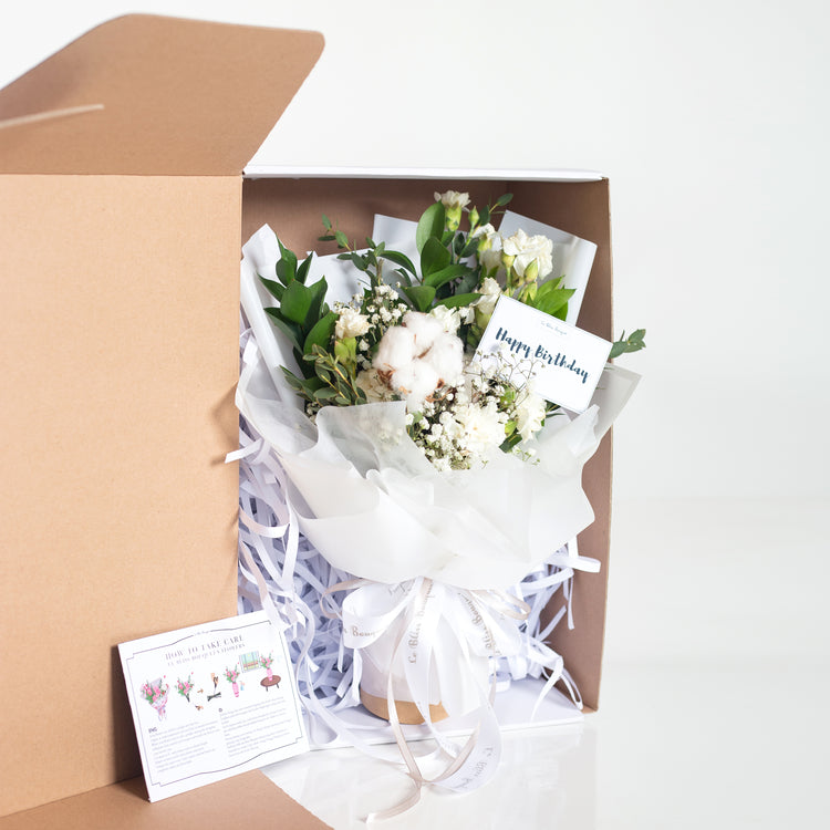 Discover the elegance of our "Smallie Nationwide White Cotton Bouquet" at Le Bliss Bouquet. Crafted with a blend of premium fresh and semi-imported flowers, this beautiful arrangement is perfect for expressing your love on special occasions. With dimensions measuring P 35 x L 25 x T 37, our bouquet is thoughtfully designed and can be shipped nationwide to all cities in Indonesia. Enjoy the convenience of nationwide shipping and a complimentary greeting card with every order. Make every moment memorable with Le Bliss Bouquet.