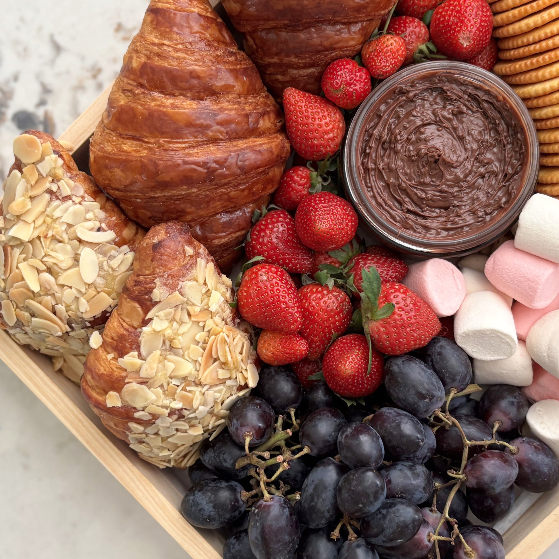 - plain croissant, almond croissant, honey, biscoff biscuit, mixed nuts, mixed grapes, marshmellow, strawberries, chocolate spread NuttaNut, cheddar cheese