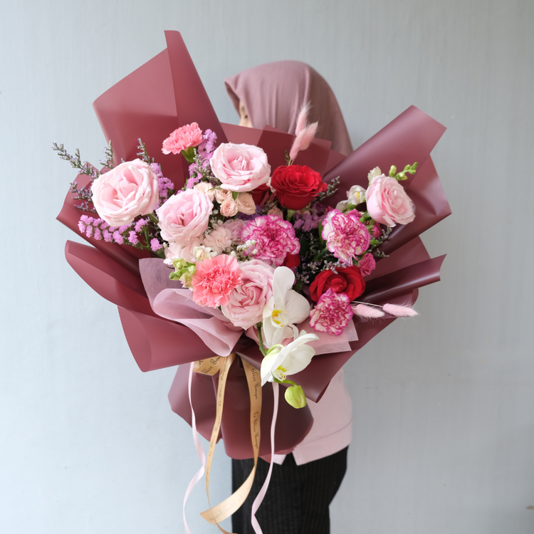 - Red rose, soft pink avalanche rose, carnation import, orchid, statice, snapdragon, caspea