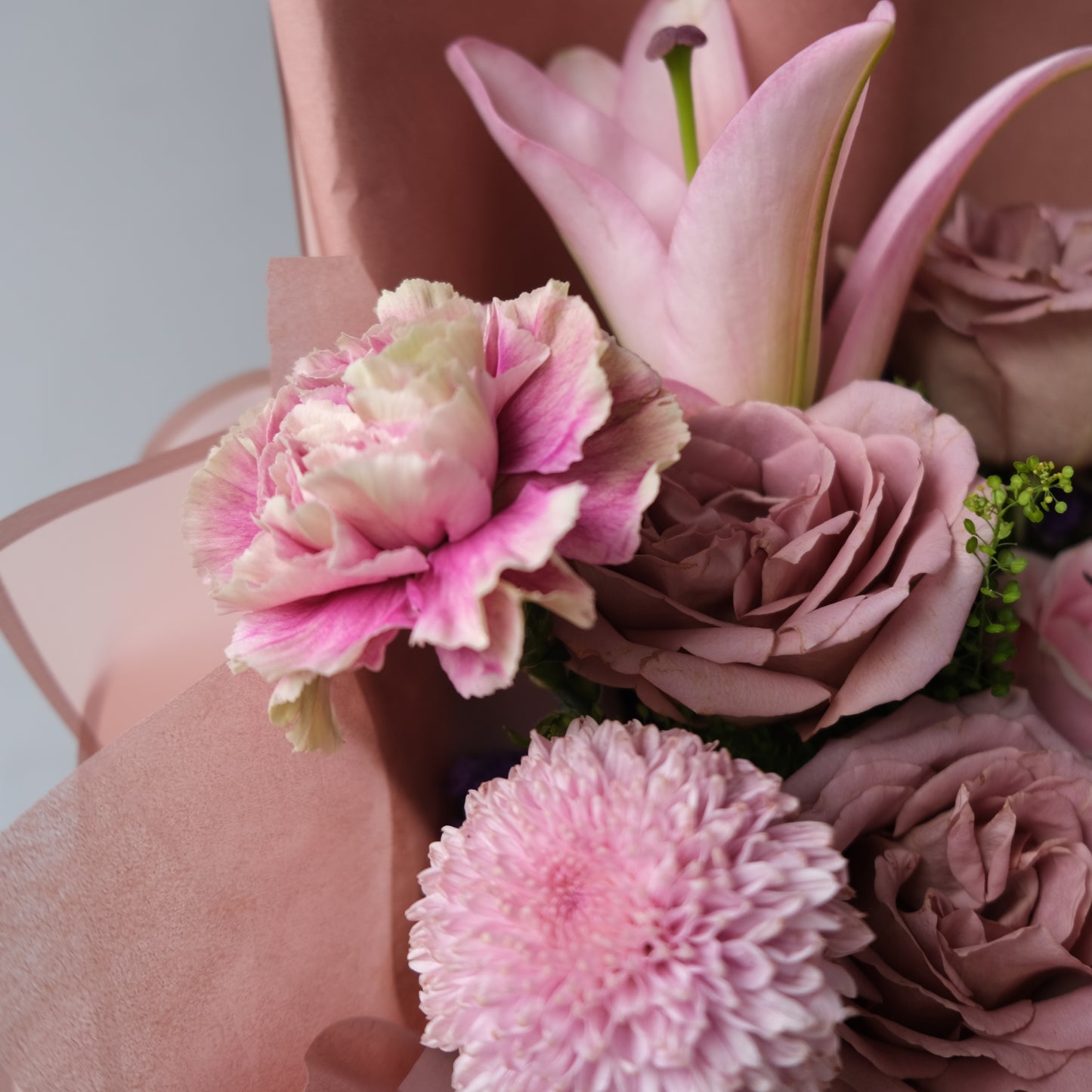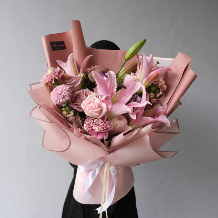 This exquisite bouquet features the timeless Lily Casablanca in delicate pink hues, paired with premium imported Carnations and Chrysanthemums. Immerse yourself in the sweet fragrance and beauty of these blooms, meticulously arranged to elevate any moment. Embrace the charm of nature with Le Bliss Bouquet's floral artistry.