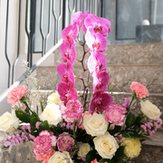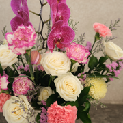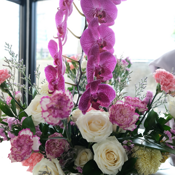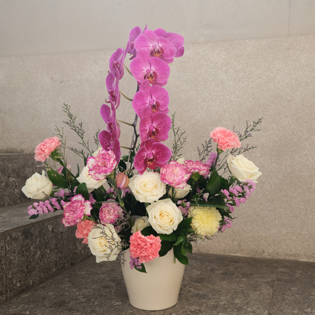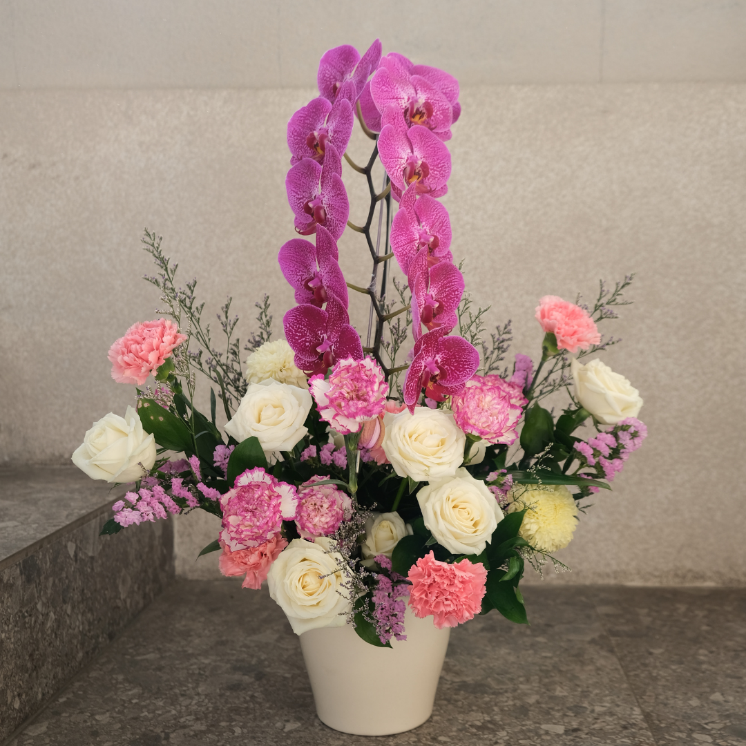 - 1 fresh purple orchid pot, fresh pink carnation and white roses, casper and statice