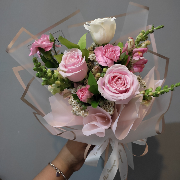 Shop Le Bliss Bouquet presents the delightful Sweet Rose Snapdragon Smallie Bouquet—a charming arrangement bursting with vibrant colors and delicate fragrances.