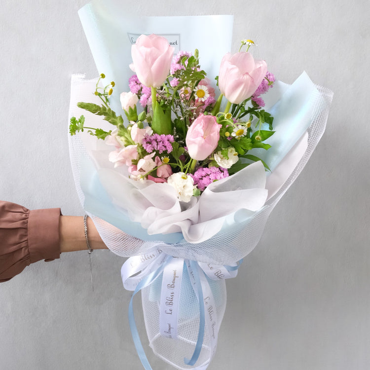 - Fresh flowers arrangement: Pink Tulip, Snapdragon, Carnation Spray, Statice and other fillers & foliages
