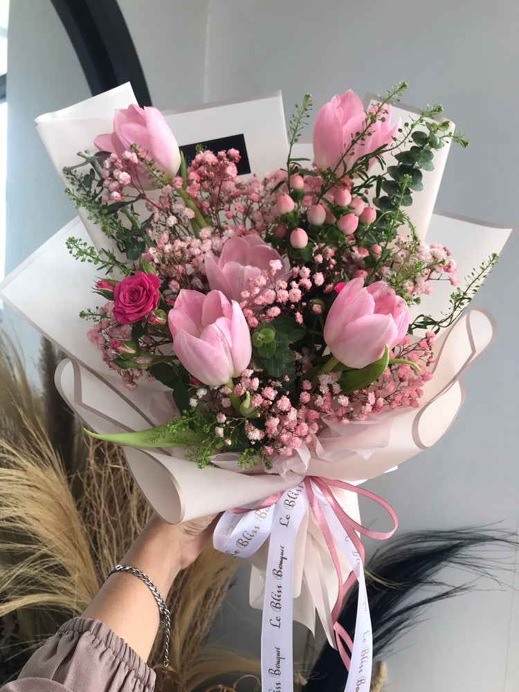 - Fresh flowers arrangement: 5 Pink Tulips, Pink babysbreath, Hypericum, babyRose and other fillers & foliage