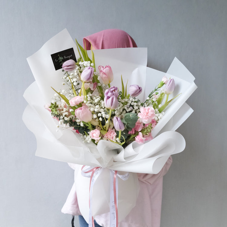 Each bouquet is a poetic arrangement that speaks the language of love. Plus, enjoy a FREE GREETING CARD to add a personal touch to your heartfelt gesture. Share the beauty of enduring love with the Tulip Pink Lilac Large Bouquet. Order now and let Le Bliss Bouquet be the messenger of your affection.