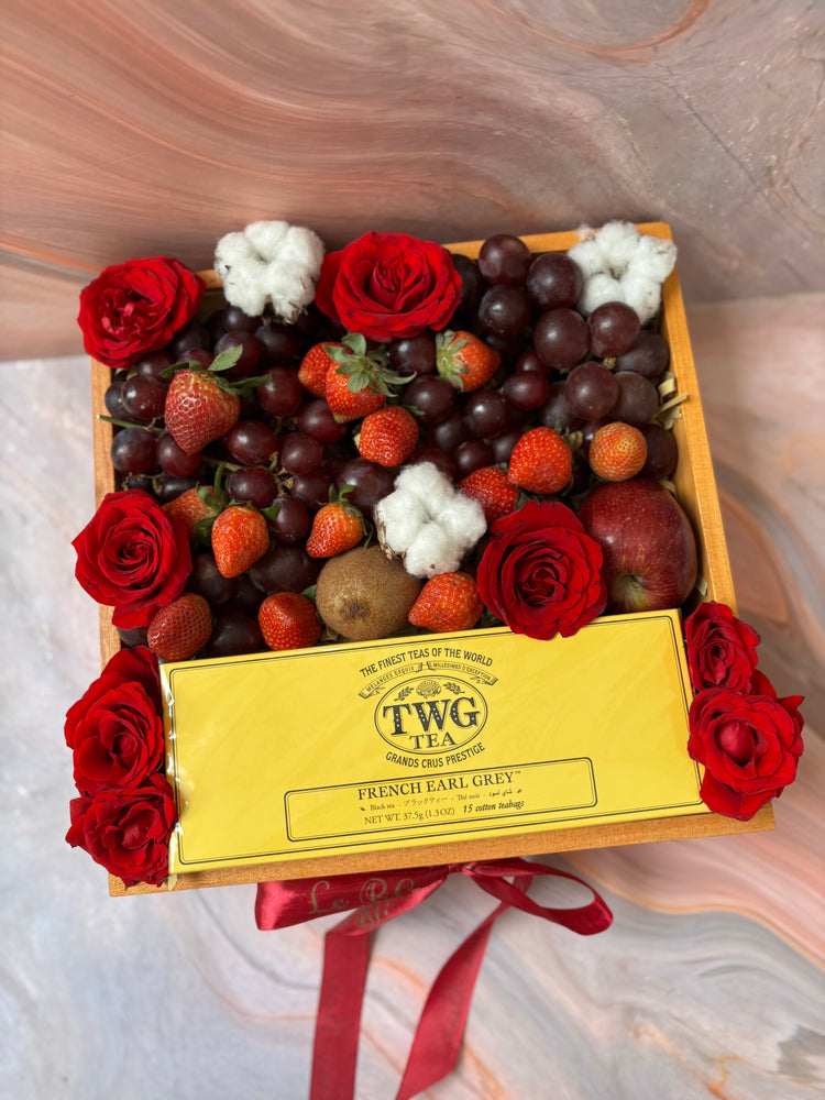 Consist of TWG Tea, Australian red grapes, Strawberries, Apple and Kiwi with fresh flowers topping