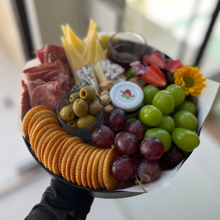 A delicious cheese platter with crackers, orange slices, grapes, soft cheese, cheddar, olives, nuts, honey, jam, strawberries, and smoked beef for the perfect bite. Perfect for 1 person