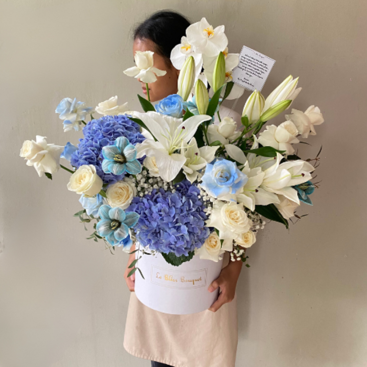 Our Grand Signature Bloombox, a bestseller, is your ticket to extravagance, perfect for any occasion. Imported from Holland, featuring dyed tulip and Hydrangea, combined with white roses and lilies, this arrangement is simply irresistible.